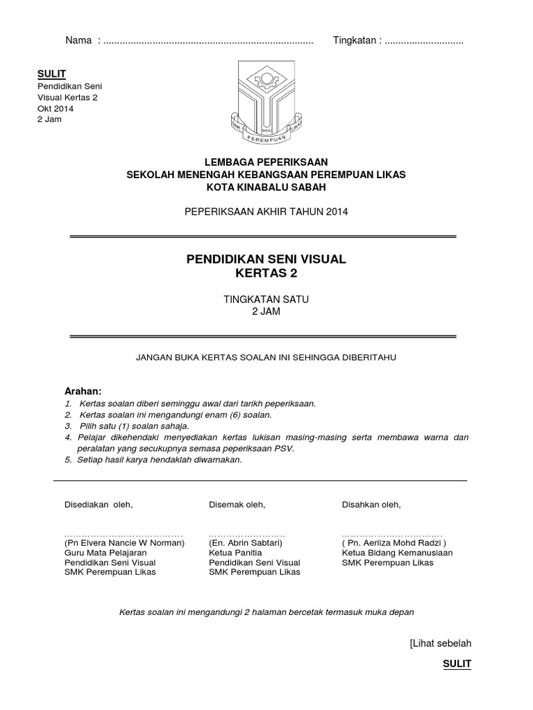 Pilih satu soalan sahaja 2. Soalan Pertengahan Tahun Pendidikan Seni Visual Tingkatan 2 adalah antara bahan-bahan terbaik yang kami adaBahan yang terdapat di sini memenuhi keperluan Pentaksiran Berasaskan Sekolah yang dilaksanakan secara menyeluruh mengikut prinsip bahawa semua mata pelajaran yang terkandung dalam KSSM memainkan peranan yang penting bagi memenuhi keperluan. Pendidikan Seni Kertas 2 Seni Halus 3 jam UJIAN 1 SMK KUNDASANG RANAU SABAH PENDIDIKAN SENI VISUAL TINGKATAN 4 KERTAS 2 SENI HALUS Tiga Jam 1.